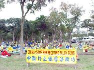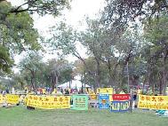 一名公园保安人员对法轮功说,你们的抗议活动“非常和平”,“非常好”,你们在中国大陆遭受迫害的故事“非常令人悲伤”。
