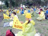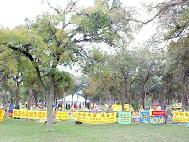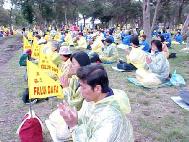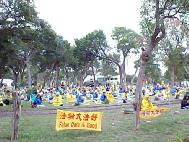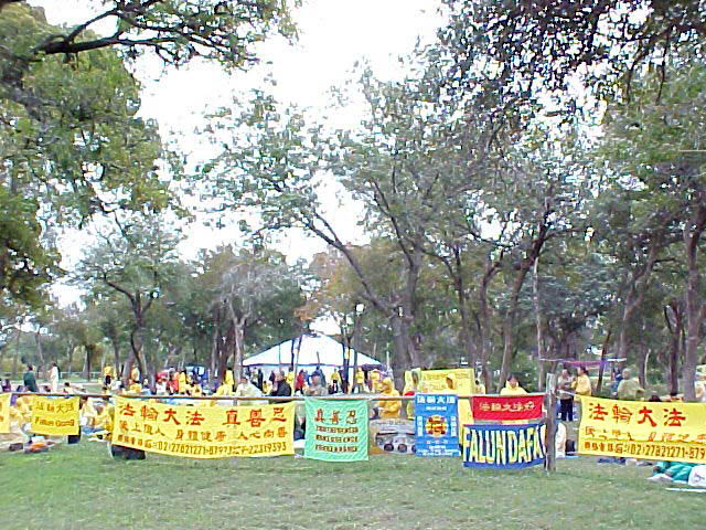 25日上午10:00开始,1500多名法轮功学员汇聚到克劳福得市的唐卡瓦瀑布公园(Tonkawa Falls Park),在宽阔的草坪上席地而坐,每隔15分钟发正念,间歇炼功。大家昨夜连夜因赶路一夜未眠,但看上去精神都很好。今天克劳福得的温度不到华氏50度,草地潮湿,阴云低垂。当地同季节平常的最高温度为华氏76度,最低52度。