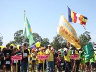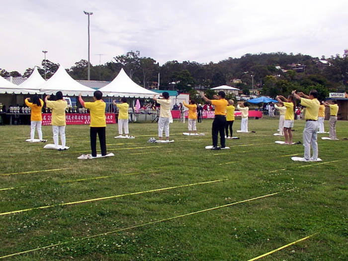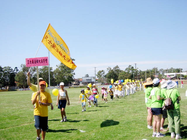 昆士兰省法轮大法学会负责人应邀参加大会主席团,并在开幕式上致词。 当参加开幕典礼的年青小弟子及学员们排成两行长长的队伍入场时, 邻队的领队不禁称奇:“你们法轮功成长得好快啊!” 其他的队员也投来赞许的目光。大法学员的队伍随着醒目的队旗徐徐绕场一周,学员们手持印有法轮大法字样的彩球,精神饱满,面带笑容,通过主席台时,赢得全场热烈的掌声。