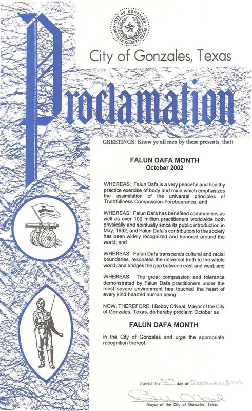 并鼓励斯维尼市市民探索法轮功的真相,并对法轮功给予嘉奖。