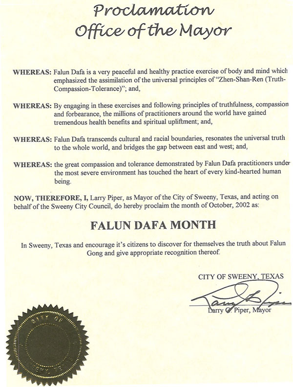 德克萨斯州斯维尼市宣布“法轮大法月”