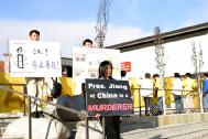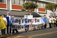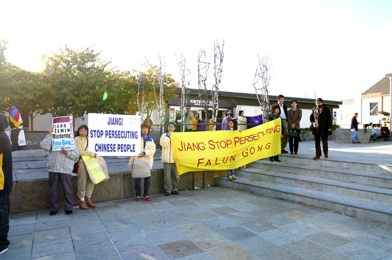法轮功的元凶首恶江XX美国之行的最后一站是旧金山,来自新加坡、台湾、南加州和北加州等地法轮大法学员汇集在旧金山中国领事馆前,要求江XX集团立即停止对法轮功的残酷镇压,并呼吁社会各界正义之士行动起来共同制止这场迫害。