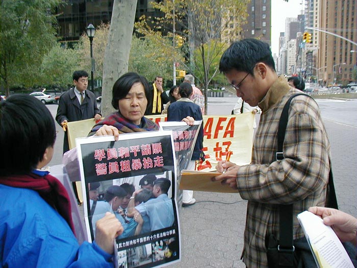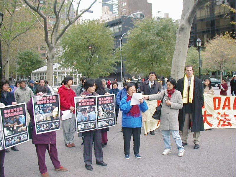【明慧网2002年10月31日】10月29日中午三名来自香港与大纽约地区的学员在联合国前的广场召开了新闻发布会,就香港政府在江XX集团的压力下,为基本法第二十三条立法,破坏“一国两制”的承诺,陈书联合国秘书长安南先生,并呼吁全世界善良的人们关注此事的发展。