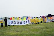 被中领馆拉来的“欢迎队”已无心于他们要欢迎的人,而是坐在桥下休息,映入眼帘的是法轮功优美的五套功法。我们感觉对这些可贵的中国人来说也是一次难得的正面了解法轮功的机会。