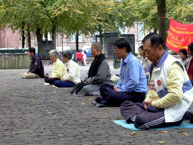 在海牙国会门前有两位过路人和我们同坐在阿姆斯特丹炼功,洪法,讲真相。