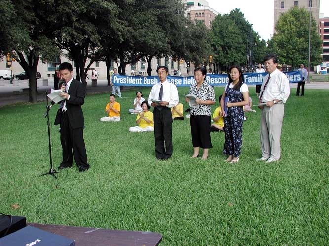 这次德州的活动是全球“紧急援救在中国受迫害的亲属”活动的一部份,学员们将从达拉斯开始,然后开车前往德州其他的几个城市巡回,举行一系列的活动,呼吁德州民众关注法轮功学员在中国遭受的残酷迫害,呼吁布什总统帮助我们在中国正在遭受迫害的亲人与家人团聚。