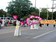 法轮功学员的游行队伍派发大法的真相材料翩翩扇子舞