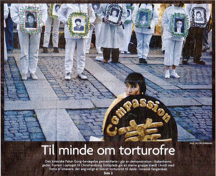 图一是第一版的大幅照片,大标题是“纪念酷刑的牺牲者。”图片说明:“昨天,中国法轮功精神运动成员穿过哥本哈根的街道进行和平示威。在走向克里斯丁堡城堡(首相府及议会所在地――译者注) 广场的队伍最前面的,是一群人数较多,身穿白色衣服,捧着那些在中国的监狱里被迫害致死的中国人的照片的人。”