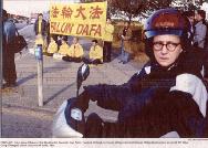 以上是第二版上的大幅照片。文字说明:“和平地——来自丹麦、中国、波兰、德国、荷兰和法国的法轮功追随者参加了示威活动。他们的横幅显示至少有477位法轮功追随者遭受酷刑迫害致死。”