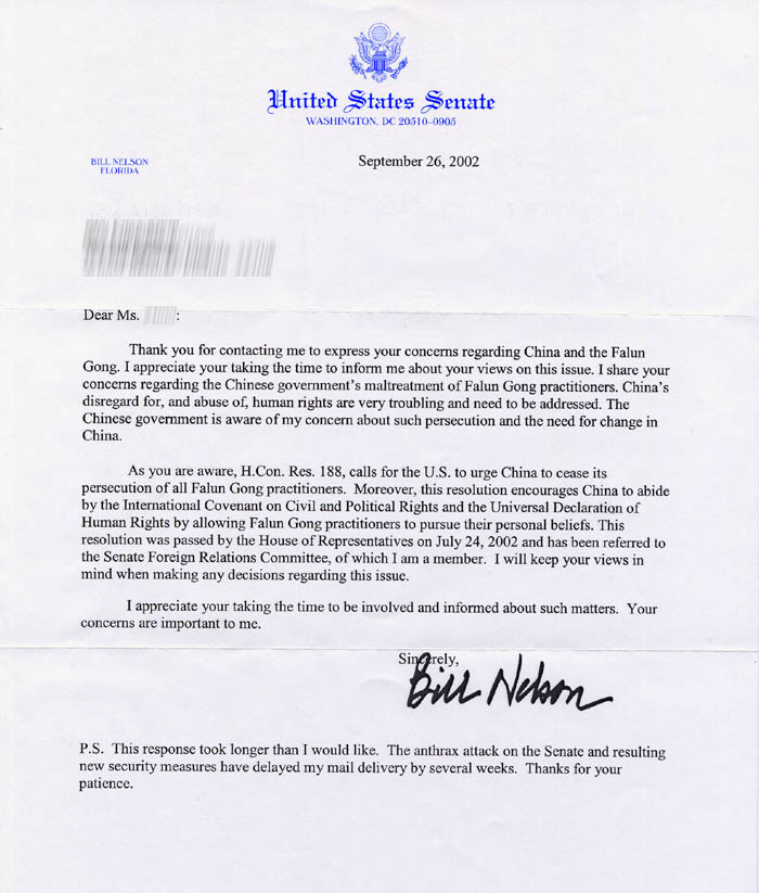 美国参议院议员比尔.尼尔森就法轮功问题给学员的回信