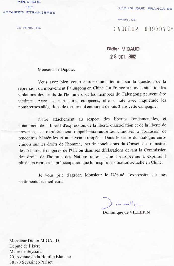 您希望我关注在中国的对法轮功运动的镇压。法国对法轮功成员会成为受害者的违反人权的行径予以密切的关注。与她的欧洲伙伴一起,法国担忧地注意到援引的与三年来的于镇压有关的酷刑。