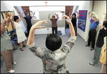 炼功:法轮功学员每个星期天在维吉尼亚州曼拿瑟斯(Manassas)的三圣主教教堂集体炼功。(照片摄影:兰世波登)