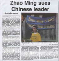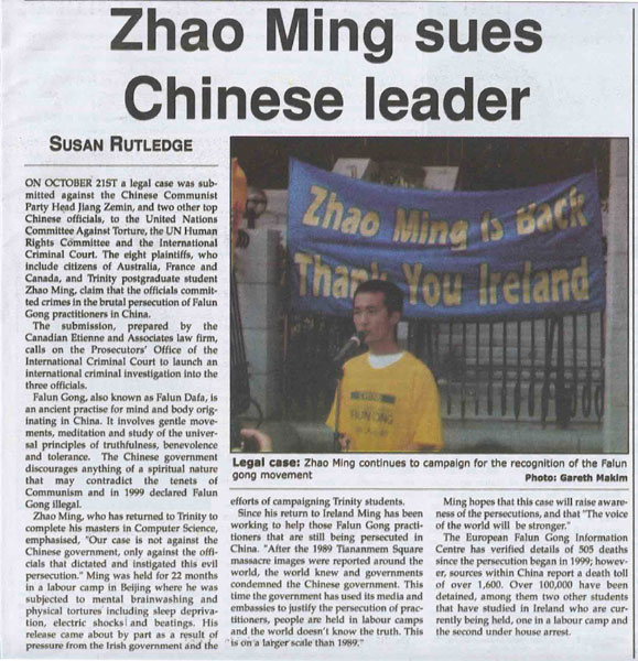 【明慧网2002年11月19日】爱尔兰都柏林三圣学院大学纪录报11月12日刊登文章,报导该院学生,法轮功学员赵明起诉中国迫害法轮功的官员的努力。