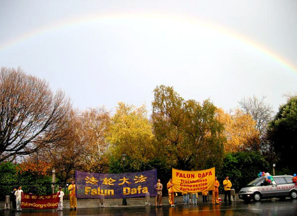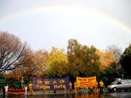 法会前一天,在中央银行广场举行的新闻发布会中,披露了爱尔兰学生刘锋和居民戴冬雪的家属在中国因修炼法轮功受迫害的情况,呼吁爱尔兰政府和人民帮助营救。随后,学员们冒着大雨绕市中心进行了和平游行,游行队伍伴着“法轮大法好”的音乐声载歌载舞,优美的中国传统文化和法轮功学员乐观、向上的精神感染了都柏林市民和当地的中国留学生,把法轮大法的美好带给了世人。经过外交部时,爱尔兰法轮大法协会的代表向外交部官员递交了请愿书。这时,雨后的天空中出现了一道巨大的彩虹。之后,学员们在游行的终点——市中心邮政总局向人们演示了五套功法。当晚,大家在三圣学院毕业纪念馆进行了学法交流。
