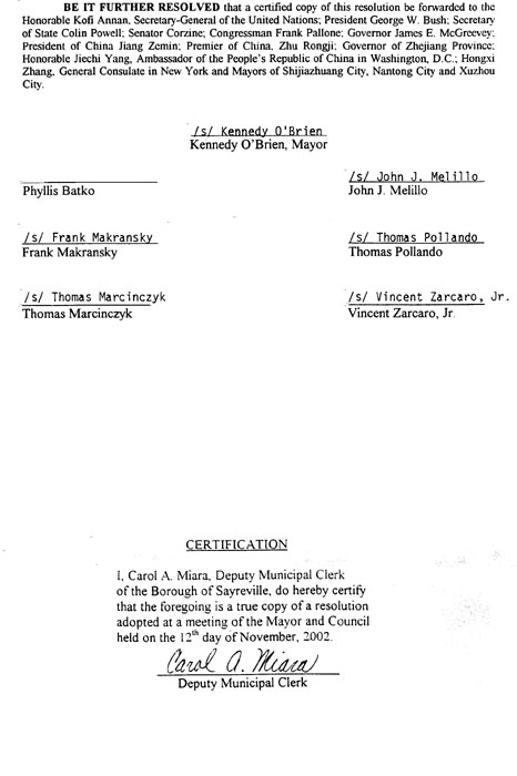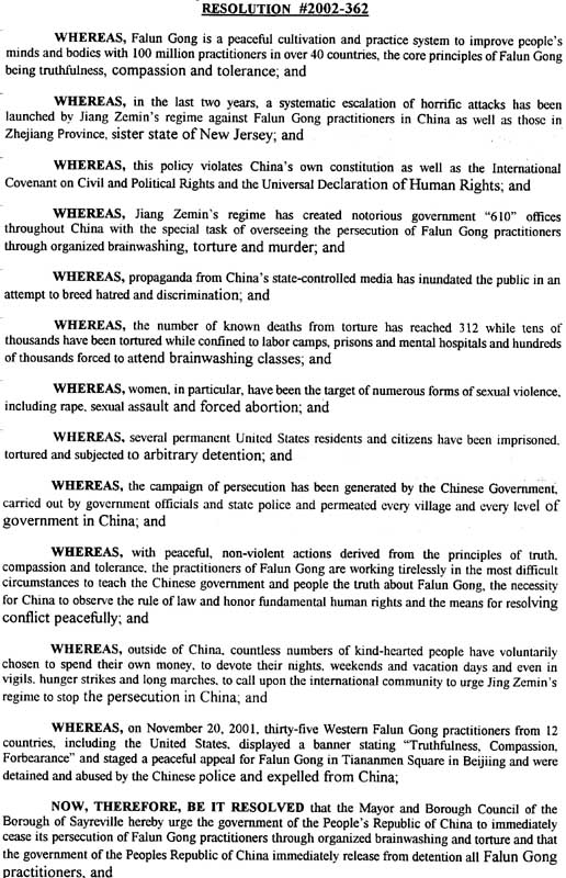 【明慧网2002年11月29日】一年前,新泽西州赛瑞维尔(Sayreville)市通过决议,强烈谴责江XX集团迫害法轮功。今年11月12日,该市再次通过决议,支持法轮功,敦促中华人民共和国江XX政府停止对法轮功学员的迫害和解散全国范围内的“610”办公室。决议认为:江XX政权对法轮功学员系统的升级迫害和洗脑是恐怖的,违反了中国自己的《宪法》以及《国际民权和政治权利条约》和《世界人权公约》;决议还特别提到35名西方法轮功学员在天安门广场为法轮功和平请愿;会议决定将决议副本寄给联合国秘书长安南、美国总统布什、国务卿、新泽西州国会参议员和国会众议员和新泽西州州长等5位美国高级官员及江XX等8位中国高级官员,再一次强烈表达作为一个美国普通城市官员与市民对这场镇压的明确态度和关切。