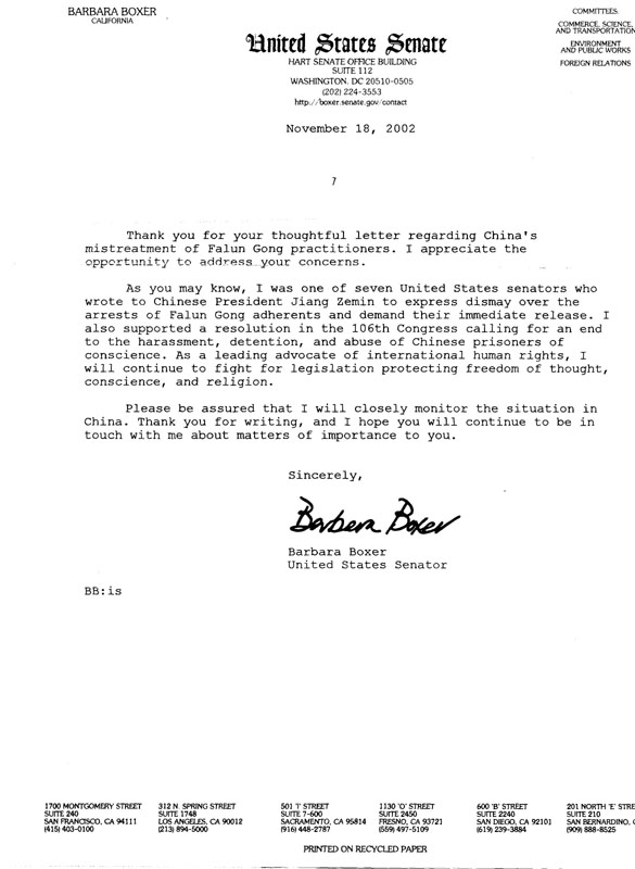 也许您已知道,我是给中国国家主席江XX写信,对拘捕法轮功学员事件表示震惊并要求立即释放他们的七名美国联邦参议员之一。我也在第106届国会上支持了一项决议,呼吁停止骚扰、拘留和虐待中国的良心犯。作为一名主要的国际人权活动家,我将继续为推动保护思想自由、信仰自由和宗教自由的立法而努力。