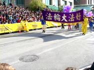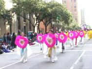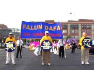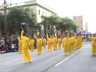 经过学员的精心构思,法轮大法队伍引人瞩目。最前面是中文字“真、善、忍”圆型标帜,和英文“法轮大法──真、善、忍”的大横幅旗帜。后面是扇子舞蹈队,表演中国民族风格的舞蹈,鲜红的圆圈旋转向前;紧接着为炼功队,大法弟子身着黄色炼功服,在炼功音乐中展示法轮功功法,路边观众不断赞叹;随后是莲花舞蹈,莲花花篮烘托着中英文“真、善、忍”。朵朵莲花波浪式向前,优美的舞蹈表演使观众雀跃欢呼;再后面是中英文的“法轮大法”的横幅,以及身着黄T恤、手持彩色汽球的弟子。“法轮大法好”的歌曲一路飘扬。大法弟子以良好的风貌和精彩的艺术表演将大法的美好展现给了数万在场的观众和数十万以上的电视荧屏前的休斯敦市民们。
