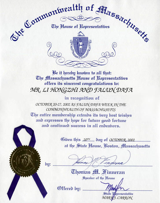 【明慧网2002年11月4日】麻萨诸塞州众议院10月20日发布公告褒奖李洪志先生和法轮大法。褒奖全文如下: