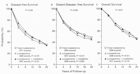 3. Fisher, Bernard; Anderson, Stewart; Bryant, John; Margolese, Richard G.; Deutsch, Melvin; Fisher, Edwin R.; Jeong, Jong-Hyeon; Wolmark, Norman: Twenty-Year Follow-Up of a Randomized Trial Comparing Total Mastectomy, Lumpectomy, and Lumpectomy plus Irradiation for the Treatment of Invasive Breast Cancer. N Engl J Med 2002;347:1233-41