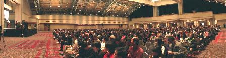 【明慧网二零零二年十二月一日】2002年11月30日,在美国宾夕法尼亚州费城临近唐人街的宾州会议中心(Pennsylvania Convention Center)举行了“2002年美东地区法轮大法修炼心得交流会”。美国东部的大法弟子,和来自美国其它地区及世界各地的两千名法轮功学员参加了这次盛会。下午两点多,师父亲临会场讲法。在全场学员的热烈掌声中,师父以两句脍炙人口的唐诗“两岸猿声啼不住,轻舟已过万重山”为开场白,告诉众弟子“迫害三年多了,邪恶已经使绝了招,大法弟子已经考验成熟了”,并给大法弟子们讲法约40分钟。