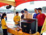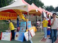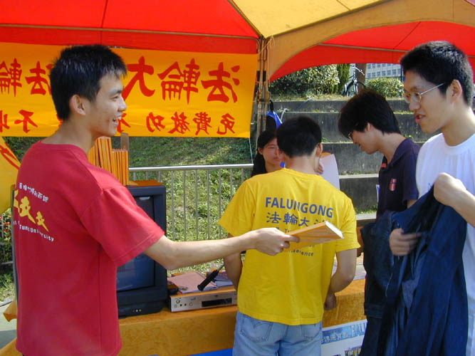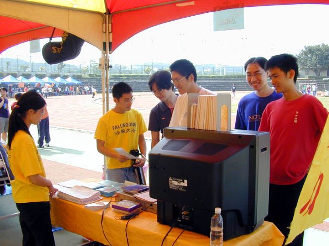 2002年12月4日为交通大学的运动会,我们也利用社团之名义设摊位,藉此和全校师生弘法讲真相。因为学生和老师们会绕场一周,所以都会看到大法的摊位,加上我们摊位的位置正好在出入口的旁边,非常醒目,来来往往的人都会看到。