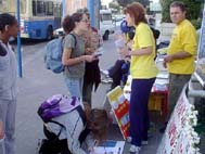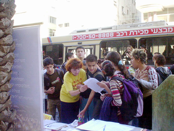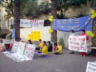 【明慧网2002年12月10日】以色列学员在周末2002年12月6日至8日连续三天58个小时在中使馆抗议对法轮功的镇压,营救熊伟。12月8号恰好是熊伟的32岁生日,以色列学员对因坚持真理而身陷劳改营里的同修熊伟给予祝福。