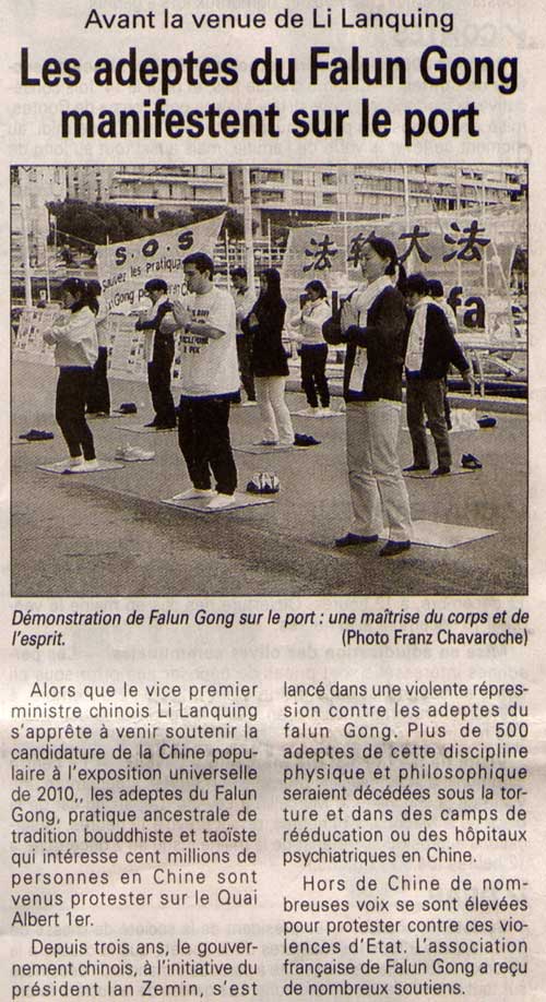 在以后的几天中,学员在洪法讲清真相中所遇到的不少官员和普通民众告诉学员,他们了解法轮功及其在中国所遭受到的迫害,因为他们看过了《摩纳哥晨报》的报导。当地人告诉我们,此报纸是摩纳哥王子所办,被视为反映官方观点的报纸。报导全文如下:
