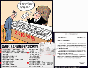 苹果日报2002年12月14日讯,一名自称任职交通银行的员工昨日向本报透露,其所属银行部门前日向全体员工派发一份有关二十三条立法的文件,要求他们签名,文件附上六式意见书,供他们「任意选择最能表达自己意愿」的一款,六式意见书字眼各有不同,但主题只有一样,即全力支持立法。
