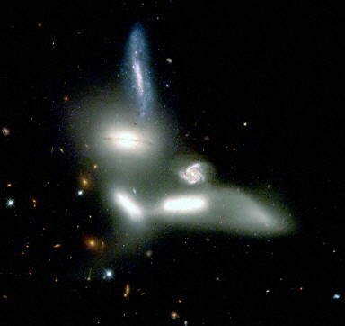 由于这些星系靠得太近,在星系之间的引力作用下,使得一些星系在整体上开始变形。那些具有同样引力的星系将会重新组成一个大的星系。