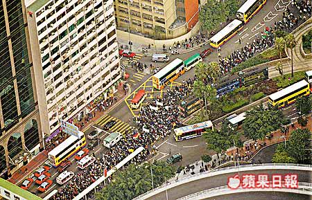 抗议者举着横幅、黑气球,并挥舞着拳头游行至中央区的政府总部,要求政府取消这个有争议的法案立法。