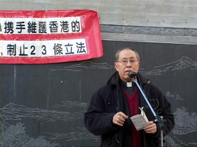天主堂尹神父在集会上发言老作家韩德光先生在集会上发言反对23条立法的游行队伍