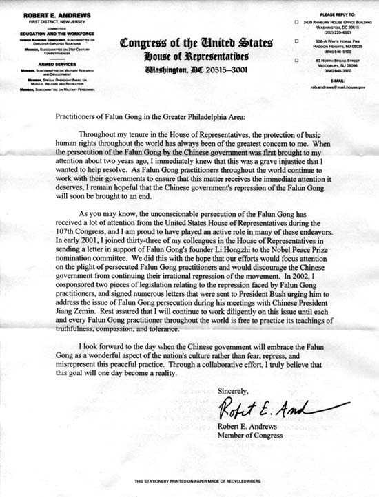 诚如各位所知,[江氏集团]对法轮功肆无忌惮的迫害引起了第107届众议院的广泛重视,我为能在国会的多项努力中起到了积极的作用而感到骄傲。在2001年初,我同众议院中33位同仁们一起向诺贝尔和平奖评选委员会递交了一封支持法轮功创始人李洪志先生的信。我们此举是希望我们的努力能使人们关注法轮功学员所遭受的迫害,阻止中国[江氏]政府继续对法轮功进行无理智的镇压。在2002年,我共同发起了两项与法轮功学员所面对的镇压相关的法律条文,而且还签署了许多呈送给布什总统的信件,敦促他在与中国国家主席江XX会晤时提出法轮功受到迫害这一问题。请放心,我将一如既往地为此事而致力,直至世界各地每一个法轮功学员都能自由地信奉真善忍。