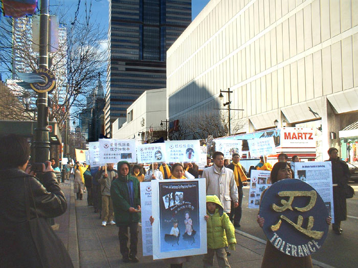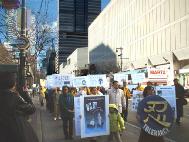 并呼吁帮助救援大陆学员。会后学员们举着巨型横幅在市中心举行了大游行。一些横幅上写着:“营救我们在中国的亲人”、“法轮大法好”,游行队伍前面的“真善忍”大字非常醒目。