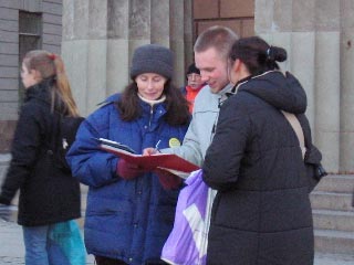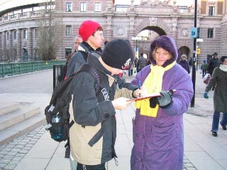 【明慧网2002年12月24日】2002年12月21日上午11点-下午15点,瑞典法轮功学员在首都斯德哥尔摩人流不息的议会广场(Mynttorget)举行了反对香港第23条立法的集会。醒目的“反对危害人权的香港第23条立法”横幅格外地引起了人们的注意。许多外出购买圣诞礼物的人们不由停下了脚步观看。当了解了真相后,他们纷纷对我们的活动表示支持,并在我们征集签名簿上留下自己的姓名。