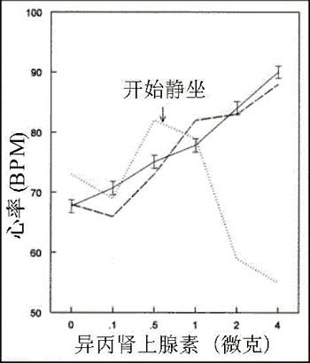 异丙肾上腺素以递增的方式,每隔3.5分钟静脉注射一次,前后共注射六次(0,0.1,0.5,1.0,2.0,和4.0微克)。在每次注射后1分钟测量心率。她在注射开始时进入静坐状态。令这两位大夫吃惊的是,当她在接受0.5微克这一剂量以后,心率不仅不上升反而开始下降(图1)。她的心跳在静坐时每分钟下降了17次。事后,当她被问起,是否有头昏、恶心等感觉时,她的回答是否定的。