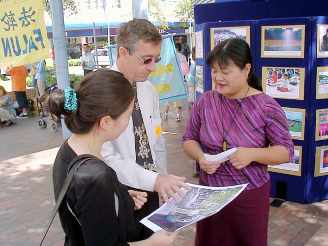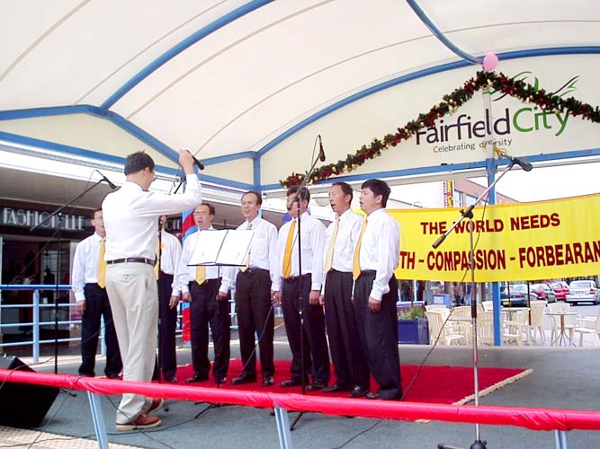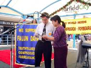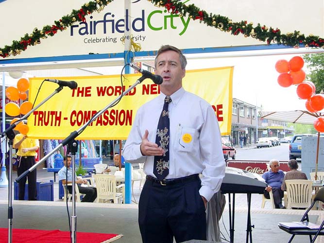 罗伯特.温肯斯先生在开幕词中说:“2001年,当我任菲费市的市长时,我有幸成为第一个在本市支持法轮大法的市长。我也为菲费市成为在澳洲的第一个法轮大法炼功点而感到十分自豪。……在菲费市,我们有许多纪念碑。今天,我们不仅仅是把法轮大法的美好告诉善良的市民,还要征集签名,在菲费市凯布拉迈达(Cabramatta)镇的自由广场立一个刻有27种语言的“真善忍”的碑。我对此是全力支持的。我认为你们应该在菲费的多元文化中心凯布拉迈达竖一个你们自己的碑。我祝你们一切顺利,也祝你们今天征集签名的活动办得成功。……我们菲费市要给全澳洲,乃至给全世界做个榜样,展示我们对不同的文化和宗教信仰的善意和宽容。……因为我相信,你们的信仰会给我们的城市和澳大利亚带来美好。”