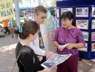 现任市长代表、前任市长罗伯特.温肯斯先生致开幕词。罗伯特.温肯斯先生在征签簿上第一个签上了姓名。 罗伯特.温肯斯先生和法轮功学员探讨立“真善忍”碑方案