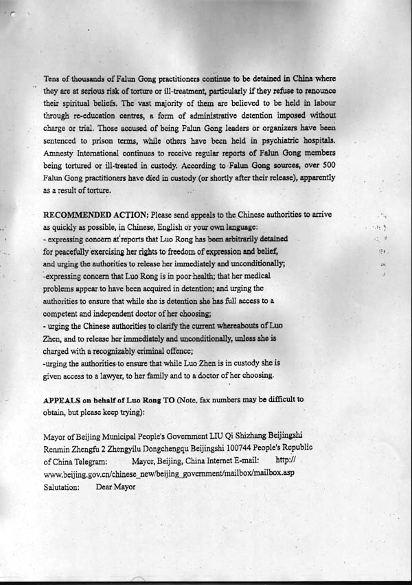 大赦国际建议采取的行动:请尽快地用英文,中文,或者你自己的母语发送呼吁信给中国当局: