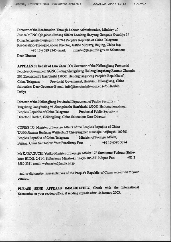 请将呼吁信立即寄出。如果是在2003年1月10日后寄出的,请和国际秘书处或您当地的大赦国际分支机构联系。