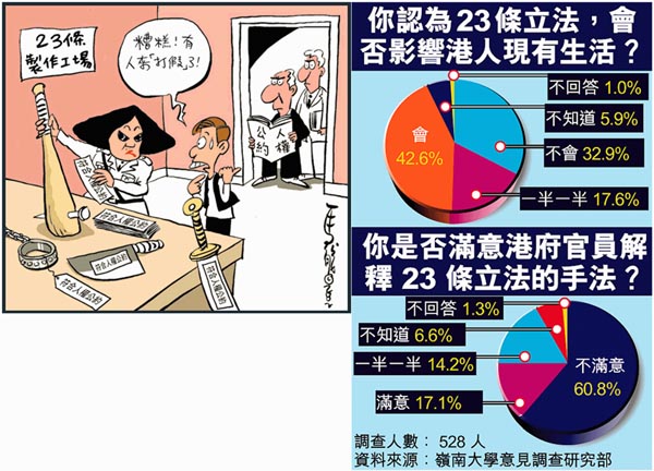对于保安局局长叶刘淑仪硬销二十三条的做法,社论亦质疑她多番保证,「纵使她不断强调,入罪的原因是除非报道或意见能够煽动他人以武力犯罪,但是否入罪不是叶太一个人说的……我们无法评估各个『他人』阅过那些报道后的反应如何。」