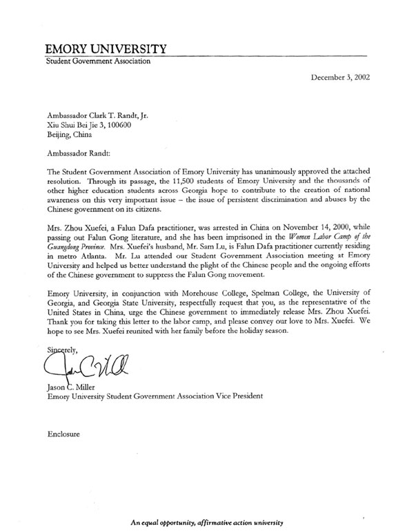 爱默蕾大学学生会协同莫豪斯(MOREHOUSE)学院、斯培尔门(SPELMAN)学院、乔治亚州大学和乔治亚州州立大学的学生,恳请阁下作为美国在中国的代表,敦促中国政府立即释放周雪菲女士。感谢您将我们的信带往劳教所,并请向周雪菲女士转达我们的关爱。我们盼望周雪菲女士能够在节日到来之前和家人团聚。