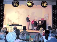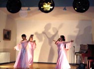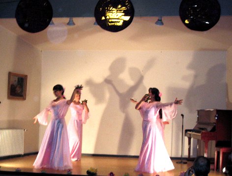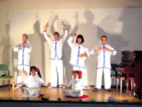 一位西人学员演唱了他自己创作的歌曲“赶快醒来吧,我的中国朋友”。歌中唱到:赶快醒来吧,我的中国朋友,看清事实,制止这场残酷的迫害。法轮功功法的表演将大家带入了一个祥和神圣的境地。一位华人学员结合中医讲述了身神合一和强身健体的道理。悠扬的古筝乐声使人们对中国文化深奥的内涵有所体悟。最后,四位女学员伴随着莲花颂的乐曲翩翩跳起了自编的莲花舞。她们那美丽的舞姿和动听的音乐将联欢会推向高潮。