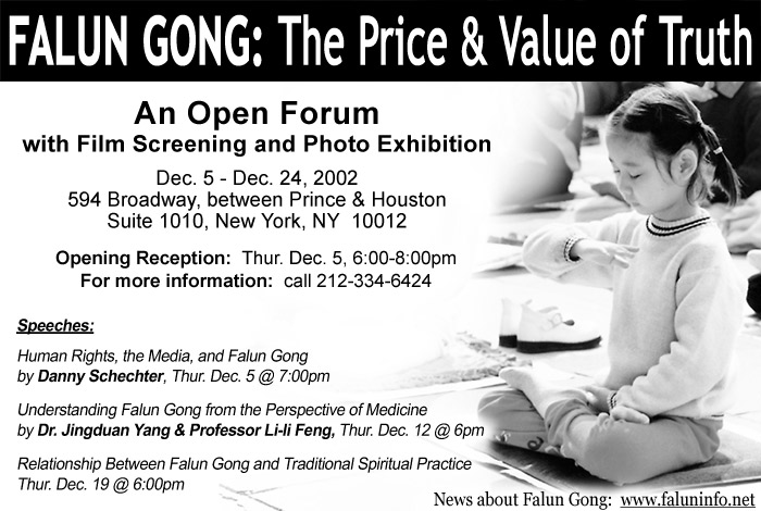撰写过大量有关法轮功文章的获奖新闻记者丹尼.谢奇特(Danny Schechter)做了开场白。他解释了中国[江氏集团]如何使用宣传机器来影响本国和其它国家的的人民,以期博得对其迫害的支持。他也谈到了在当权者不公正时,真实和决心将自然地带来变化。
