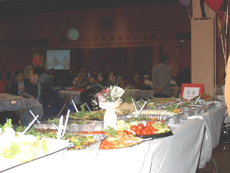 学员自做的丰盛晚餐受到上千群众的欢迎,不少人对法轮功学员的手艺和精致、味美的佳肴表示称赞。晚会开始时,市议员伯克森先生(Balkisson)、律师麦克摩提先生(McMurty)、华侨界知名人士、加拿大联合国协会多伦多分会副主席奥普瑞先生(O'Pray, Vice President of the United Nations Associationin Canada, Toronto Region)以及法轮功学员代表上台致辞,嘉宾们在发言中称赞法轮大法和大法学员为全人类和各国人民和社会的巨大贡献,并向大家祝贺新年。法轮功学员在致辞中说:我们在这里济济一堂,不仅是庆祝中国的春节,更重要的是庆祝真善忍宇宙法理在人间的洪传。寒冬即将过去,春天即将来临,法轮大法在中国、在全世界同庆同颂同贺的春天指日可待了!