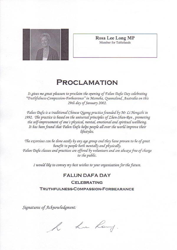 【明慧网2002年2月10日】2002年1月29日,马利巴市(Mareeba)“法轮大法日”的开幕庆典令人难忘。阿萨通高原的议员里隆女士提前20分钟就来到了会场。里隆女士非常友好,庄重宣布马利巴“法轮大法日”开幕,并提出在她签署公告前将公告宣读于众。她是我们邀请的贵宾中第一个提出此类要求的人,我们立即欣然接受。从她的朗读语气中,我们深深感受到了她的真诚。