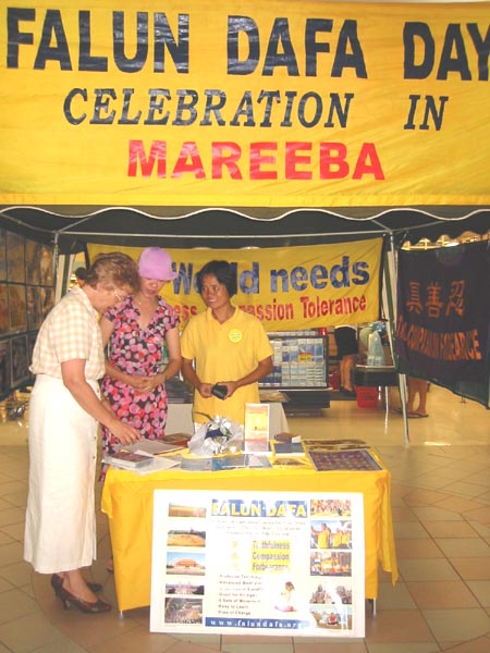 商业中心内,人流不息,很多人止步索取资料和观看功法演示。只要有机会,我们就向人们介绍法轮大法在中国遭受迫害的真实情况。几乎所有听到我们介绍的人都在请愿书上签了名,还有很多人问是否会在马利巴建立炼功点。我们把离马利巴开车一小时的凯恩斯市炼功点介绍给他们,并告诉他们法轮大法之友已向当地图书馆赠送了《转法轮》和《法轮功》两本书,以及教功录像带。
