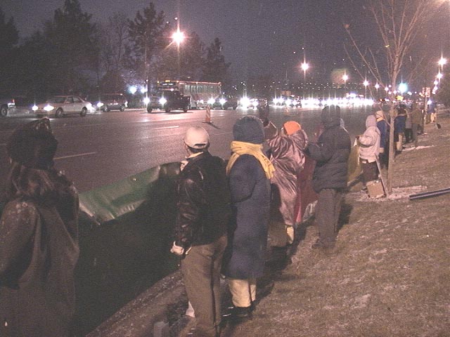 或许是因为看到学员们近日来散发的大法材料而对大法有了一定的了解,或许是被学员们近十个小时的无声的展示而感动,晚十点过后,当开幕式结束,各国代表团离开会场时,看到路边的横幅、烛光,漫天飞舞的鹅毛大雪和面带微笑向他们招手的学员,来自不同国度、不同种族的运动员们纷纷做着各自祝福的手势,向这一群默默的男女老少表达自己的敬意,有不少人喊:“祝福你们!”“我们支持你们!”车辆则轻声鸣笛以示支持。学员们一直等到午夜十二点钟各代表团都离去以后才结束请愿。