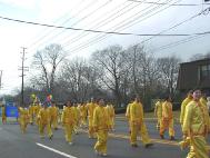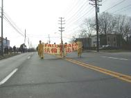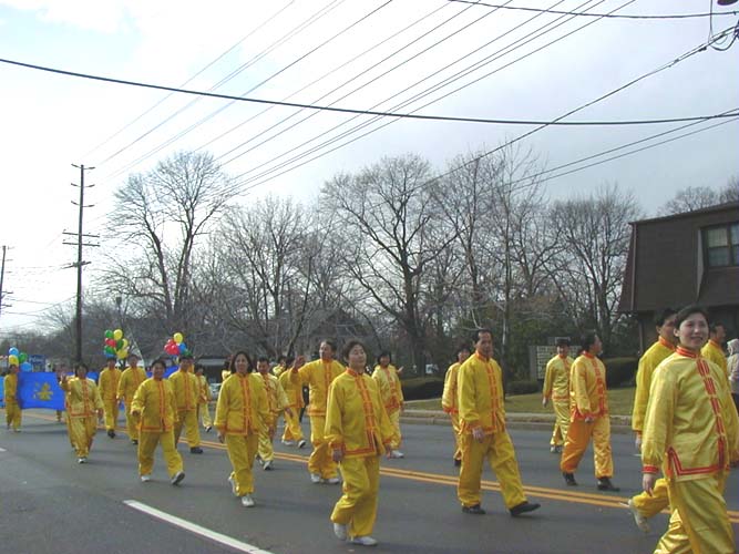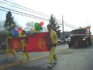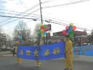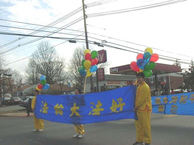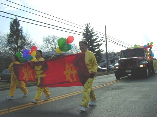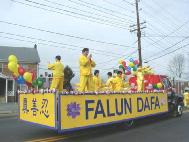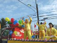大法弟子们经过精心的努力,最后做成了庄严而又漂亮的彩车。学员们手擎“法轮大法”,“法轮大法好”,“真善忍”,“生命需要真善忍”和“新年好”等横幅和匾牌,整个大法弟子的游行队伍构成了一片金黄的世界。祥和的场,整齐的队伍和良好的风貌给观众们留下了深刻的印象,震撼了许多人的心,不时博得热烈掌声。