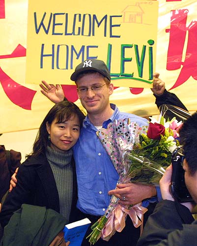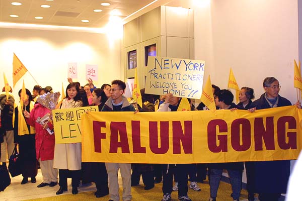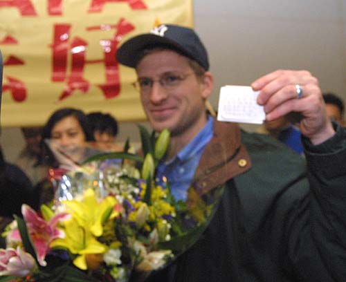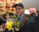 | 李伟和妻子团聚 | 学员们欢迎李伟归来 | 李伟展示他的中英文“论语”(《转法轮》),那是他在北京被非法拘捕后所剩的唯一的物品,警察抢走了他的大法书籍、手提电脑、PDA等一切物品。他在飞机上打电话说的第一句话是:“我想回家读书。” |