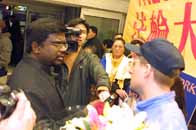 | 学员和记者们准备迎接李伟.布莱迪从北京归来 | 李伟从机场通道出来 | 当地媒体记者采访李伟 |